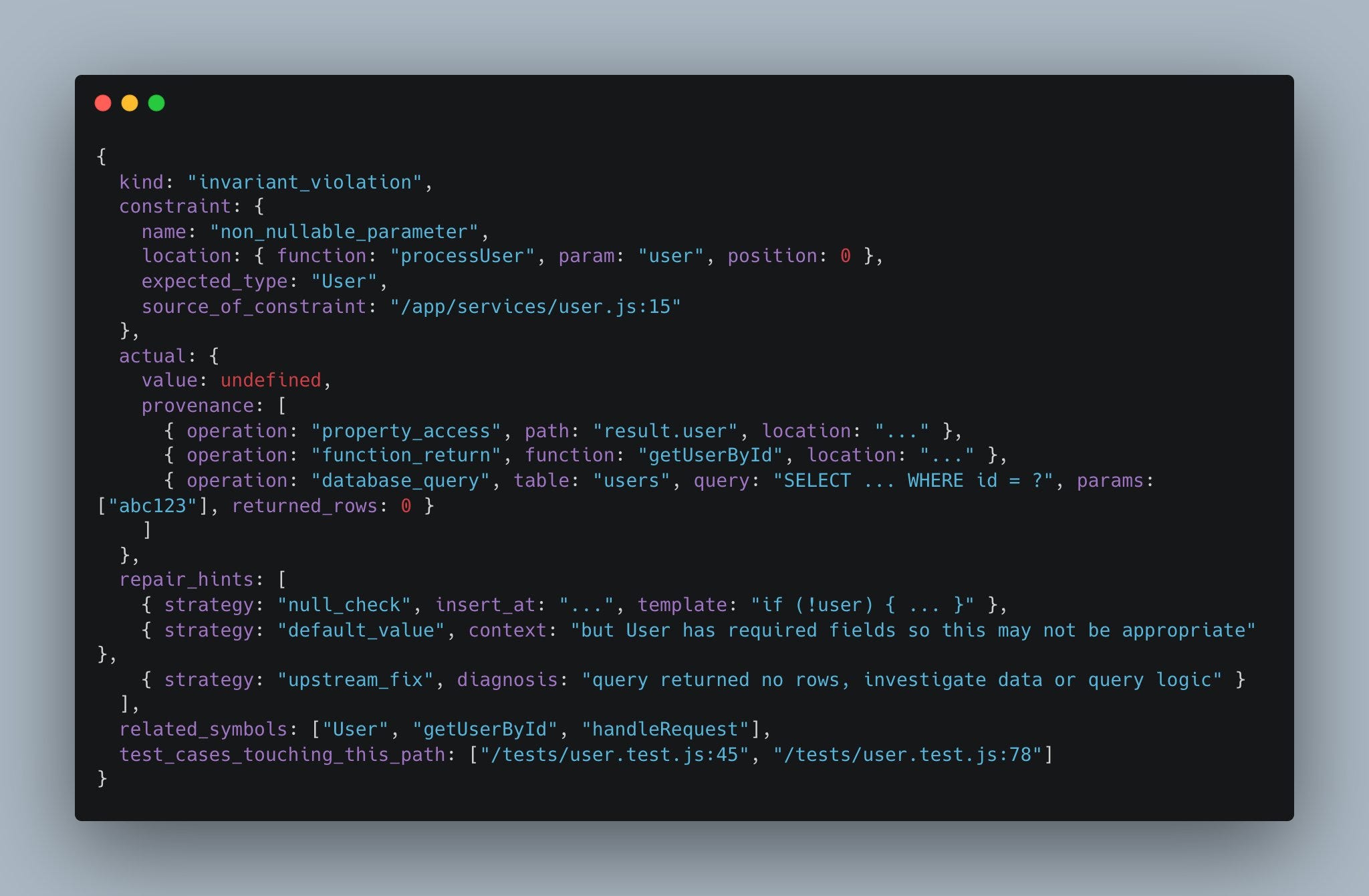 TypeError: Cannot read property ‘id’ of undefined at processUser (/app/services/user.js:47:23)A human with context can look at this and think: okay, I passed some bad data into the id property of processUser, this happened somewhere upstream that I already know about, and I have a rough idea of the conditions under which that thing can get its value.